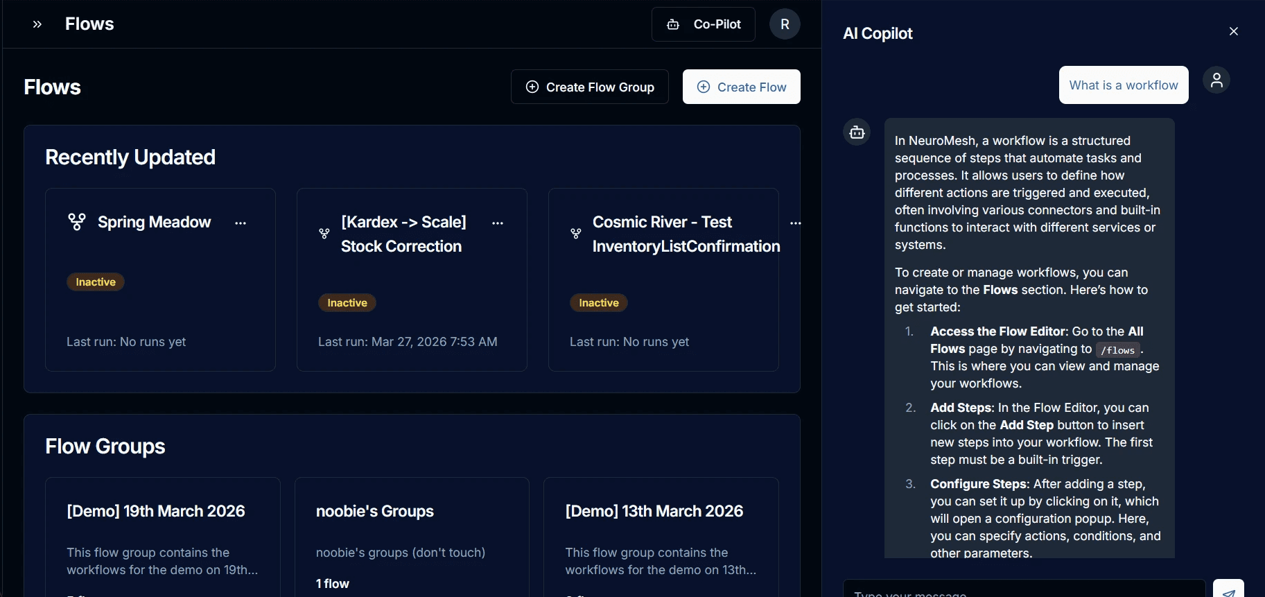 Today, we're taking a monumental leap forward by introducing our new suite of NeuroMesh AI Copilots. These intelligent agents aren't just bolt-on chat windows; they are deeply context aware systems embedded directly into the fabric of the platform. They exist to help you build at warp speed, troubleshoot smarter, and navigate complex integrations without ever needing to open a frantic support ticket.