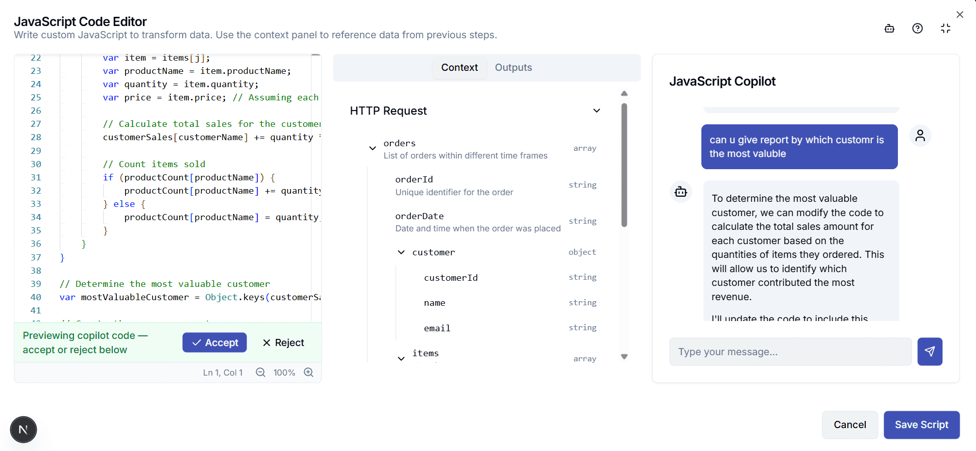 Writing workflow automation logic often means translating business intent into code - fast. The JavaScript Node Copilot does exactly that. Embedded directly inside the JavaScript node editor, it acts as a context aware pair programmer that already knows your entire workflow.