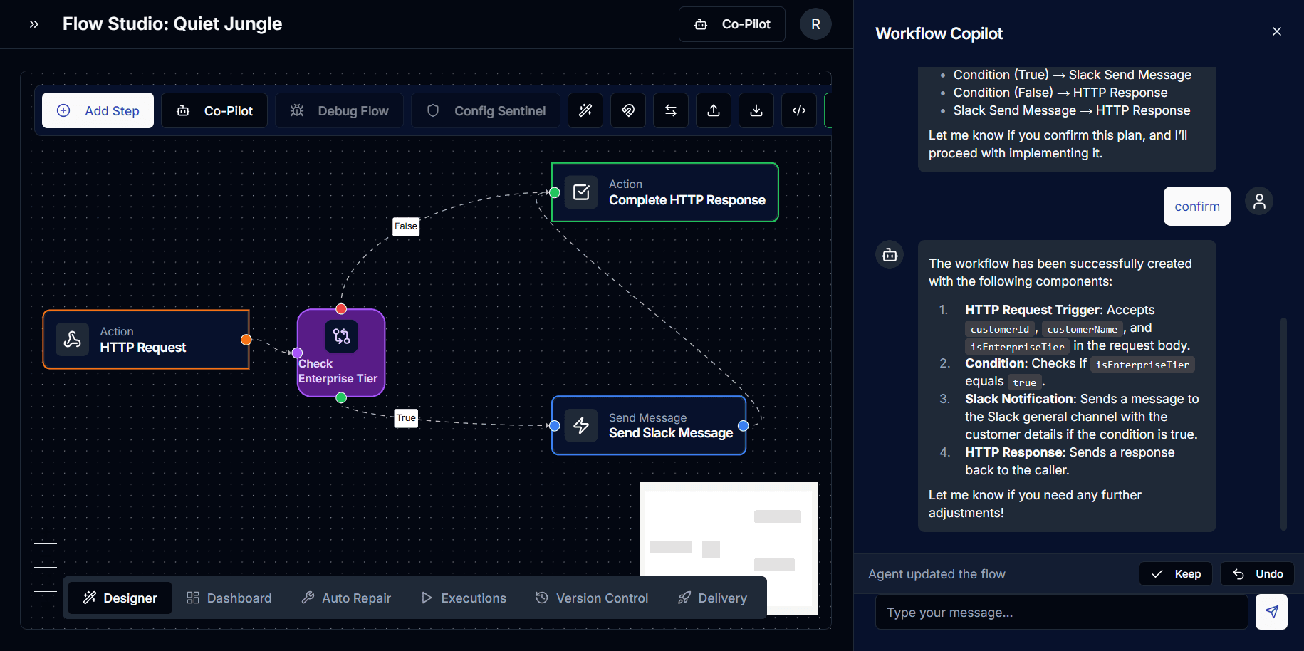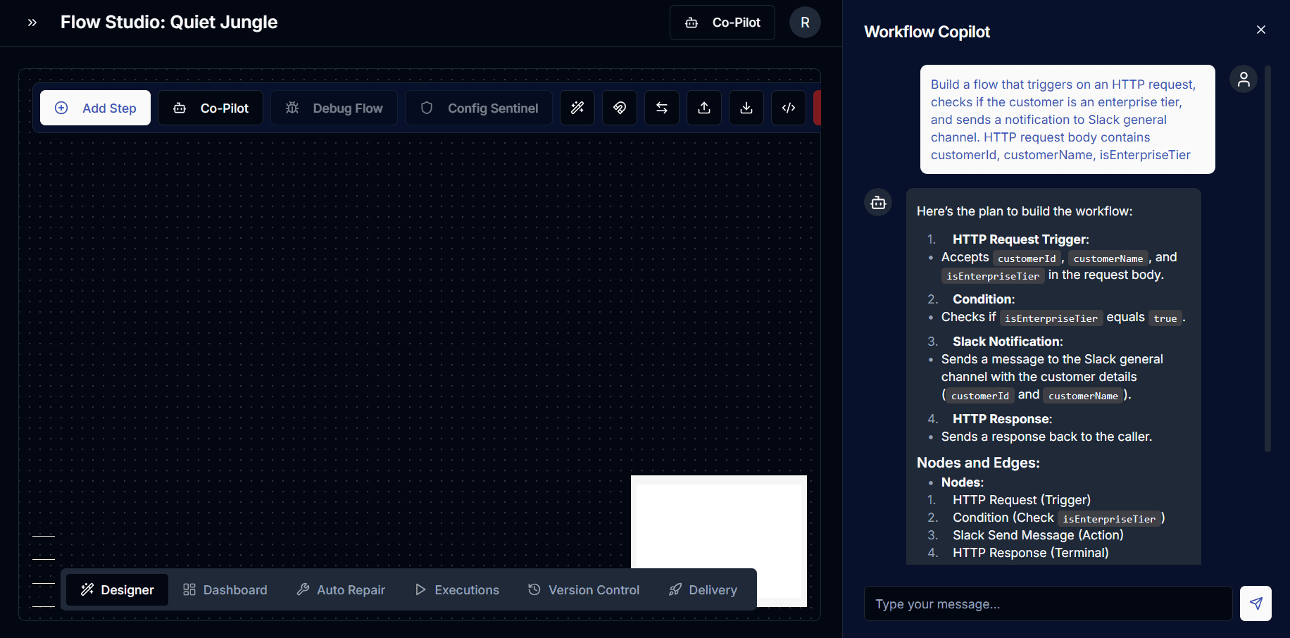 The Workflow Copilot dynamically maps your intent to our vast connector catalogue. It fetches the required components, wires up the edges computationally, maps the data inputs, and generates the visual architecture right in front of your eyes. It knows the difference between an HTTP Trigger, a Condition, and a Slack Connector without you having to lift a finger.