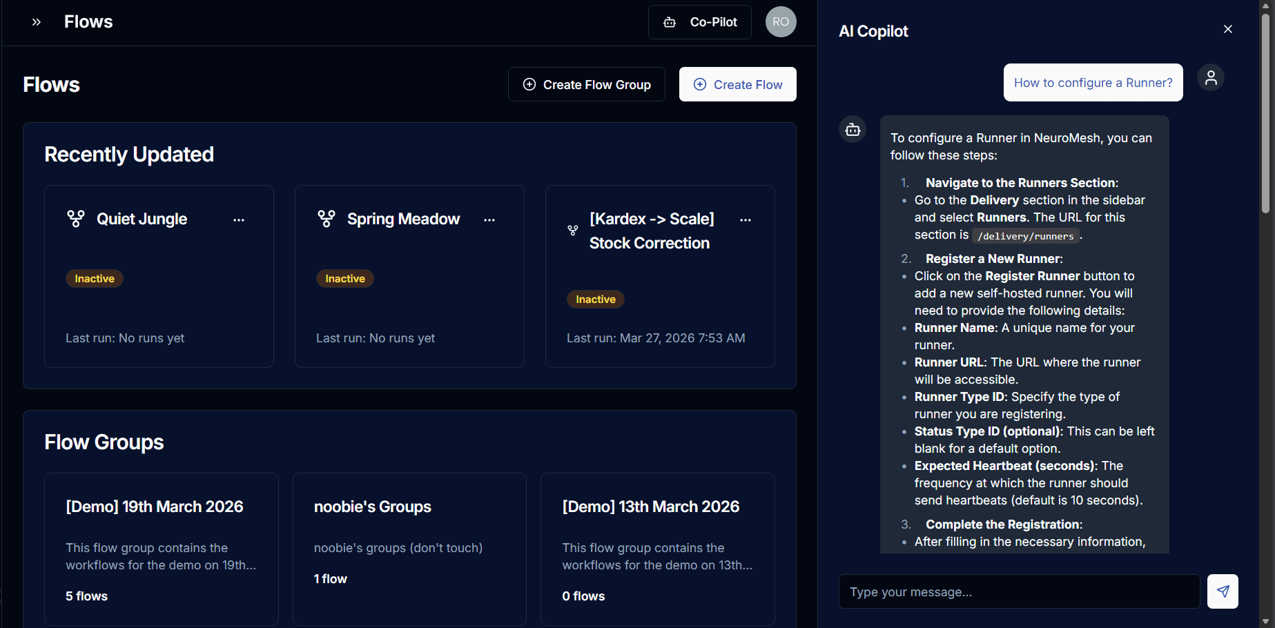 General Copilot: "To configure a Runner in NeuroMesh, you can follow these steps….."